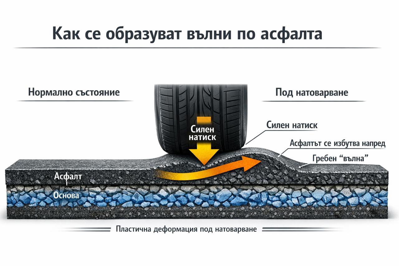 Когато говорим за вълни по асфалта, техническият термин е „пластична деформация". Това не са пукнатини, които се появяват от студ, нито хлътвания от размиване на основата. Вълните са резултат от движението на асфалтовата смес под натоварване.